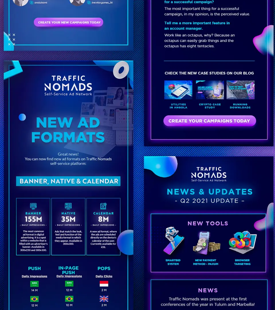 A Traffic Nomads é uma advertisment network com o objetivo de ajudar media buyers e advertisers a adquirirem tráfego qualificado. O desafio aqui foi consolidar a identidade visual existente através da criação de diversos materiais de marketing. Foram desenvolvidos banners para redes sociais, blog e e-mail marketing, estacionário e peças gráficas para conferências.